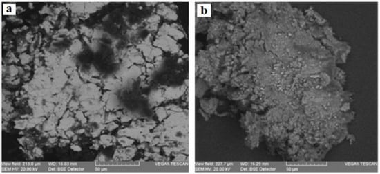 For the SEM-EDX analysis, an SEM model VEGA II LSH produced by Tescan (Brno, Czech Republic) and coupled to an EDX detector type Quantax QX2 made by Bruker/Roentec (Berlin, Germany) has been used. The analysis of the samples was carried out at a magnification of 200…2500×, with an acceleration tension of 30 kV, and the work pressure was lower than 1 × 10−2 Pa. The resulting image was constituted by secondary electrons (SE) and backscattered electrons (BSE). The SEM-EDX microscopy involved the collecting and processing of the samples.