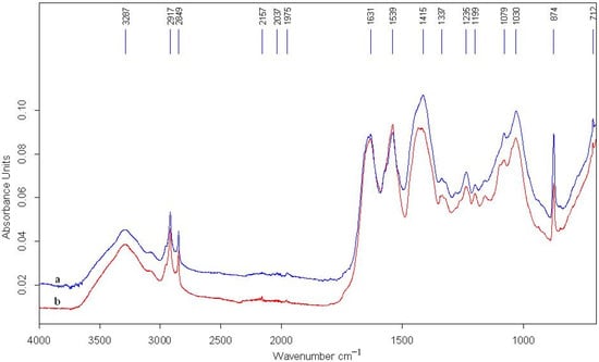 We notice a perfect overlapping of the peaks of the supports, but their intensities differ. The peak from 3287 cm−1 shows that there was registered valence vibrations ν for the -OH and -NH groups. They belong to amide A with a band range of 3400–3100 cm−1 and form the first component of the ν(NH) frequency in the Fermi resonance of amide II.