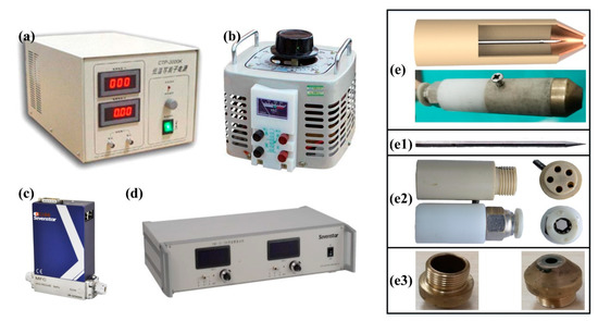 As shown in Figure 1, the APPT generating system includes an alternating current (AC) power supply (CTP-2000K, Suman, Nanjing, China), voltage regulator (TDGC2, Zhengtai, Hangzhou, China), gas mass flow controller (CS200, Sevenstar, Beijing, China), gas flow meter (D08-2F, Sevenstar, Beijing, China) and plasma generator. The details of plasma generator with bare electrode discharge are shown in Figure 1(e,e1–e3). Atmospheric pressure plasma discharges as bare electrode discharge, and the space of the electrodes is filled with high-purity nitrogen (99.99%), which can produce a stable atmospheric pressure plasma jet at a low voltage. During the test, the plasma power supply frequency was set to 58.6 kHz, the driving voltage was 1.53 kV, the nitrogen pressure was 0.5 MPa, the nitrogen flow rate was 12 L/min and the nozzle diameter was 2.5 mm. The stable plasma jet with a length of 16 mm was generated after the working gas flows through the insulated cavity and discharged under the given parameters.