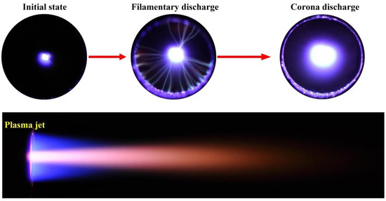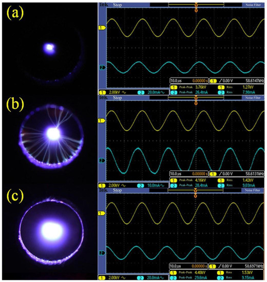 As shown in Figure 2, the discharge state was changed with the increasing voltage. The stable and long plasma jet was not generated until the discharge voltage U = 1.53 kV, and the corona discharge was found between the two electrodes at the same time. In order to explore the relationship between the form of discharge and the increasing voltage, oscillograms of plasma under different discharge voltage were tested by oscilloscope (DPO 2014B, Tektronix, OH, USA), which was shown in Figure 3. The filamentary discharge was found when the voltage increased from 0 V to 1.27 kV (Figure 3a). However, the generated plasma jet was too short to spray from the insulated cavity at the same time. When the discharge voltage increased to 1.42 kV, filament discharge occurred between the high-voltage tungsten needle electrode and the ground electrode (Figure 3b), the generated plasma jet of which was unstable. When the discharge voltage increased to 1.53 kV, as shown in Figure 3c, the discharge state changed from filamentary discharge to corona discharge, and a large-scale, uniform and stable plasma jet could be formed at this time.
