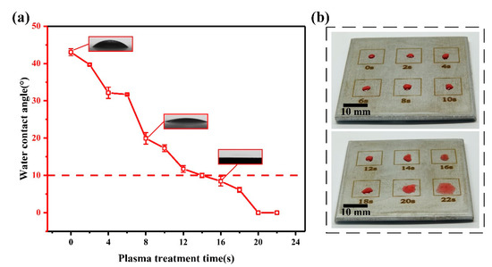 The machined 50 mm × 50 mm × 6 mm samples were used in wettability tests. The workpiece surface was divided into six 10 mm × 10 mm rectangular squares. The rectangular squares were treated for different times (2 s, 4 s, 6 s, 8 s, 10 s, 12 s, 14 s, 16 s, 18 s, 20 s and 22 s) by N plasma. The red water droplets were dropped onto the surface of the processed workpiece. The contact angle was measured by an optical contact-angle meter (SL200KS, KINO, Boston, MA, USA). The volume of water droplets used in the measurement was 5 μL.