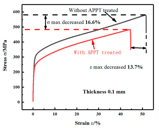 Figure 6 shows the stress-strain curve of a pure iron tensile specimen with and without APPT treatment. As shown in Figure 6, the maximum tensile stress σmax of the original specimen was 579.1 MPa, whereas that of the APPT-treated specimen was 483.3 MPa. The maximum tensile strain rate εmax of the original and treated specimens is 51.7% and 44.6%, respectively. After plasma treatment, the maximum tensile stress and tensile strain of the sample decreased by ~16.6% and 13.7%, respectively. The tensile test results show that the yield strength and fracture stress of pure iron can be decreased by APPT treatment.