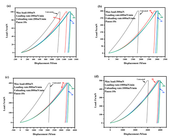 The surface micromechanical behaviors of pure iron with and without APPT were characterized by using a nanoindentation instrument. The force-displacement curves under various loads are shown in Figure 7. Figure 7 shows that when the maximum indentation loads were set to 100–500 mN, the maximum indentation depth hmax and residual indentation depth hf of the plasma-treated samples increased significantly (~50%) compared with those of the untreated samples. An increase of storage time (0–48 h) resulted in a slow increase in varying degree of hmax and hf.
