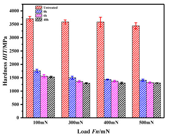 The microhardness curves of the pure iron surface under different conditions are shown in Figure 8. Figure 8 shows that for the same pressing load, the microhardness of the pure iron surface without APPT ranged from 3600–3700 MPa, and that of the pure iron surface with APPT decreased by ~60%. When the pure iron surface was treated by APPT, the microhardness of the pure iron surface decreased slightly with placing time for 0 h, 6 h and 48 h. This phenomenon shows that the APPT can reduce the surface hardness of pure iron materials and soften the pure iron material surface.
