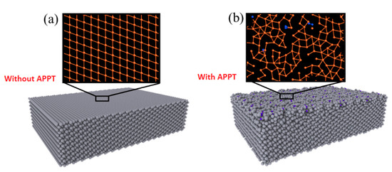 Stacking structure of Fe atoms: (a) without and (b) with APPT.