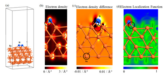 To study the chemical bonding and properties between the N and Fe atoms on the iron surface, the electronic structure of the Fe-N system was calculated by first principles, as shown in Figure 11. The charge density between the N and Fe atoms is low (Figure 11b), which indicates that the electron orbit coupling between the N and Fe atoms is relatively weak. Therefore, the possibility of covalent bond formation is relatively low. Strong charge transfer occurs between the Fe and N atoms (Figure 11c) and the possibility of ion bond formation is high because of the electron transfer from Fe to N atoms. The electron localization function shows that the electron is localized strongly near the N and Fe atoms, which is consistent with the ion bond characteristics, as shown in Figure 11d. The above analysis indicates that the combination of Fe and N atoms occurs mainly in the form of ionic bonds [22]. Figure 11c shows that the presence of N atom reduces the electron density between Fe–Fe atoms. Fe–Fe atoms are combined by metal bonds. This requires electron participation and is equivalent to a weakening of the metal bond strength between Fe atoms. However, this weakening effect is localized. The charge density of the Fe atom that is closer to the N atom will be affected, whereas the charge density of the Fe atom farther from the N atom will not be affected. Therefore, the effective depth of plasma treatment depends mainly on the injection depth of the N atom.