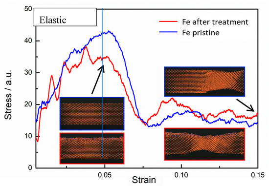 By using the atomic stacking structure model of a plasma-treated iron surface (as shown in Figure 10), the uniaxial tensile stress-strain curves of iron with and without N plasma treatment were obtained by molecular dynamics methods, as shown in Figure 12. The yield stress of the iron decreased after plasma treatment, which is consistent with the tensile experiment results (as shown in Figure 4). According to the evolution of atomic structure in the uniaxial tensile process given by molecular dynamics, the reason for the decreasing yield stress was analyzed. In uniaxial tension, the elastic deformation of iron occurred first, which is represented by Fe–Fe bond tension. Then the Fe lattice Fe was distorted, and plastic deformation of the iron occurred. A maximum stress appeared in the elastic deformation stage, and the magnitude of the stress depended on the number and strength of Fe–Fe bonds. The results in Figure 10 show that many Fe–Fe bonds are broken, and the existence of N atoms weakened the strength of the Fe–Fe bonds. After plasma treatment, there was a clear amorphization on the surface (shown in Figure 9, Figure 10, Figure 12 and Figure 13). Therefore, surface amorphization may be another important reason for the reduction of yield stress [28,29,30]. Therefore, the plasma treatment decreased the yield stress of iron.