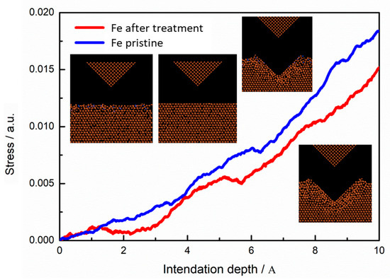 The change of iron microhardness with and without N plasma treatment was studied. The stress-depth curves of nano-indentation from molecular dynamics are shown in Figure 13. An increasing number of atomic iron structures yielded and plastic flow occurred during constant indenter pressing. The material microhardness is determined by the yield stress. The microhardness will be reduced correspondingly because of a reduction in iron yield stress by plasma treatment. The simulation results are consistent with the experimental results in Section 3.3 (as shown in Figure 8).
