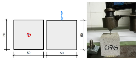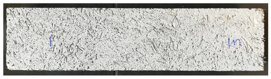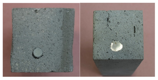In addition, the vertical wire fibers were subjected to pull-out tests in order to evaluate the bond between the reinforcement and the lightweight mortar. To this end, samples with five layers were extruded and individual wire fibers were inserted to a depth of approximately 3.5 cm. Cubes with dimensions of 50 × 50 × 50 mm were sawn out (see Figure 5) and the length of the protruding fiber was measured. Thereby, we were able to calculate the bond length.