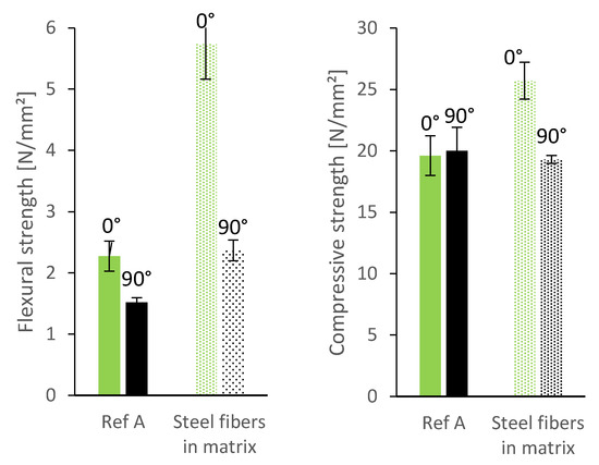 The compressive strength after 7 days is not affected as much by the layer bonding. It is slightly increased by the steel fibers for the prisms sawn out at 0° in comparison to the reference mixture (see Figure 7, right).