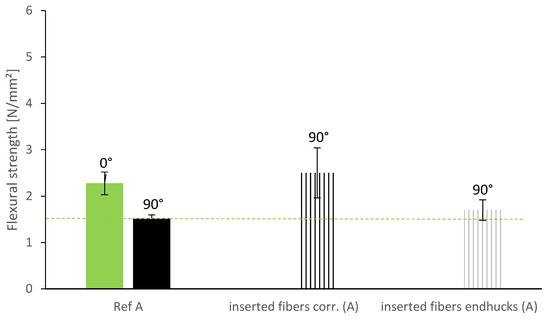 The effect of vertically inserted wire fibers depends on the geometry of the fiber. As displayed in Figure 9, the corrugated fibers show a significant average increase of 1 N/mm2 (equal to 64% increase) in flexural strength at 90° in comparison to the reference material. The fibers with end hucks, on the other hand, show only a minor increase of 0.2 N/mm2 on average. The fibers with end hucks are consequently sufficient to compensate the effect of the irregular building rate. It can be assumed that the wire fibers have no effect on the flexural strength at 0° and therefore have the same flexural strength at 0° as the reference. The corrugated wire fibers reach a flexural strength at 90° that is even larger than the flexural strength at 0°. With this type of fibers, it is thus possible to compensate the anisotropy induced by the layer bonding. The standard deviation of the results indicates that the effect is dependent on the quality of the insertion. We will come back to this matter in Section 3.3.