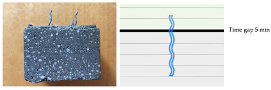 The vertical reinforcement was inserted in the freshly deposited layers. The smaller wire fibers were inserted every four layers and had an overlap length of 1 cm. To simulate the insertion of reinforcement in a cold joint area, the time gap was increased to 5 min for the layers, where the fibers were inserted. The 16 wire fibers were placed manually in predetermined intervals of 1.6 mm and 4.8 mm between the layers in order to be able to cut four prisms (see Figure 3, left). The extrusion process was stopped shortly before the next layer was deposited. In this phase, the material was conveyed further and disposed separately.