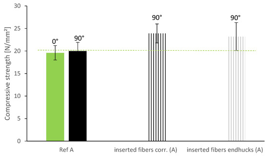 The compressive strength of the specimen is increased by the inserted wire fibers despite the longer time gaps between the layers. Both fiber types show similar values for compressive strength and a minor increase of 3.5 N/mm2 (17.5%) on average (see Figure 11).