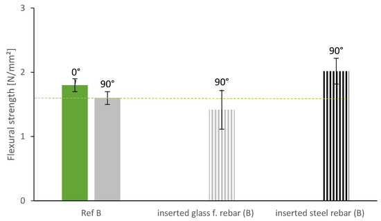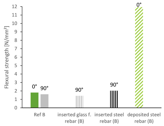 The insertion of vertical elements might lead to cavity formation if the rheological properties of the lightweight mortar prevent a circumvallation of the reinforcement element after insertion. When comparing the horizontally deposited rebars, which were almost directly encompassed by fresh material with the vertically inserted ones, which were inserted into layers of different age, we can see a large discrepancy (11.9 N/mm2 vs. 2.0 N/mm2, see Figure 14). The flexural strength of the specimen with the horizontal reinforcement element is almost sixfold, compared to the specimen with vertical reinforcement element.