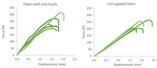 In order to assess the quality of the bond between wire fibers and lightweight mortar, pull-out tests were conducted as described in Section 2.5. The results of the pull-out tests of the wire fibers show a large variation, see Figure 13. This can be attributed to the manual insertion of the fibers and can be eliminated by an automatized fiber insertion using a robotic arm, which can enable straight insertion with better precision. Surprisingly, the fibers with end hucks show comparable bond strength (2.2 N/mm2) as the corrugated fibers (2.1 N/mm2) even though the latter performed better in the flexural bending tests.
