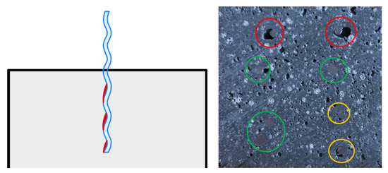 Schematical cavity formation around the vertically inserted fibers (left). Different quality of bond between fibers and mortar (right—red: bad, yellow: satisfactory, green: good bond behavior).