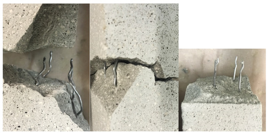 The overlap length of the fibers is very short in this test series (1 cm). Thus, the investigated samples failed at the layer bond of the larger time gap and the fibers were pulled out (see Figure 10). The effect of the wire fibers might consequently be increased by increasing the overlap length and thus avoiding the local accumulation of the weak points of mortar and reinforcement.