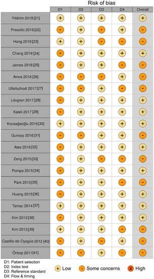 - Whiting, P.F.; Rutjes, A.W.; Westwood, M.E.; Mallett, S.; Deeks, J.J.; Reitsma, J.B.; Leeflang, M.M.; Sterne, J.A.; Bossuyt, P.M.M. QUADAS-2: A Revised Tool for the Quality Assessment of Diagnostic Accuracy Studies. Ann. Intern. Med. 2011, 155, 529–536. [Google Scholar] [CrossRef]