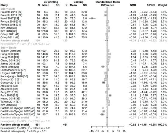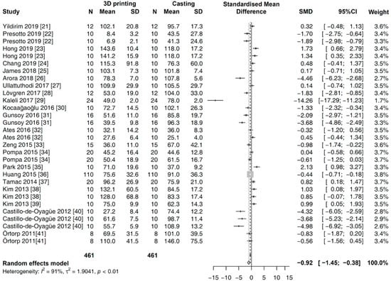 The standard mean difference (SMD) between the prostheses fabricated using 3D printing and those fabricated using casting methods in each study was calculated with the following equation: