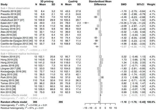 The subgroup meta-analysis on the different types of prosthesis presented no significant difference in terms of the estimated SMD between single crowns and multi-unit prostheses. Thus, the 3D-printed prostheses had a better marginal fit than the prostheses fabricated using casting methods, irrespective of the size. Meanwhile, in the subgroup meta-analysis on the measurement methods, the tendency of marginal discrepancy between the 3D printing and casting groups was significantly different between articles that used the direct observation and the silicone replica technique. In the articles with the direct observation, large differences in the misfit were found between the 3D printing and casting groups (SMD = −3.0735, p < 0.001). However, within the comparison of the articles with the silicone replica technique, the difference in the misfit between the 3D printing and casting groups was non-significant (SMD = 0.3379, p = 0.2461). This finding might be related to the measurement procedure and reliability in the testing methods of the studies [42]. The silicone replica technique is the most commonly used nondestructive method that is applicable in the clinical setting; however, its major drawback is its susceptibility to error [43]. The thin silicone layer in the margin area can be torn or distorted during silicone replica formation. The sectioning of the silicone replica could also be problematic because of human error when the cutting position is inconsistent or the cutting is conducted in oblique planes. When the section is not standardized, the measurements are unreliable [44]. Specific sectioning strategies, such as the use of fiducial markers or cutting devices, have been suggested in several studies to help reduce the possibility of sectioning error [26,29,32,38,40]. Reading error is another issue among observers during the manual selection of measurement points to measure the marginal gap in the acquired images [45]. Thus, suitable standardized procedures are necessary to increase the reliability and reproducibility of the outcomes of individual experiment studies and minimize the bias risk in the meta-analysis performed on the studies.