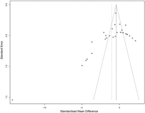 Funnel plotting and Egger’s regression test showed a moderate risk of publication bias for both global analyses (p = 0.0528) (Figure 6). Accordingly, a random effects model was used to evaluate the SMD results.