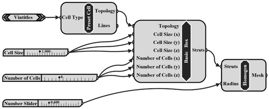 The metal lattice structure unit cell was constructed by parametric modeling method. The “Preset Cell” in the flow chart (Figure 1) was used to control the basic configuration of the constructed metal lattice structure. The unit cell size and number of arrays in the x, y, and z directions can be adjusted by dealing with the corresponding values in the “Basic Box”. The “Radius” in “Homogen” controls the radius of the unit cell struts; therefore, unit cells with different volumes can be obtained by inputting different “Radius” values. The acquired model can be intersected by the unit cube volume using a Boolean operation to obtain the unit cell with the desired relative density.