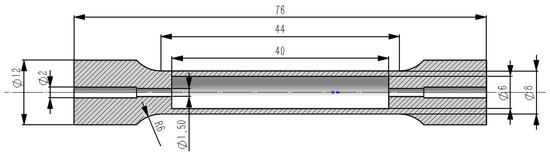 All of the designed unit cells (Table 1) were 1.5 mm × 1.5 mm × 1.5 mm in size. To effectively eliminate the effect that size has on the structural performance of the unit cell, the planar array of the unit cells was set to 4 × 4 for this study [15], resulting in a section size of 6 mm × 6 mm. Furthermore, the wall thickness of the tensile test specimen shell was designed to be 1 mm, making the total diameter of the tensile test specimen 8 mm. According to ISO 6892-1 [28], a proportional relationship exists between the gauge length and the diameter of the tensile test specimen: L0 = 5d0. Therefore, we set the porous unit cell array to 4 × 4 × 27 and intersected the obtained porous block with a cylinder measuring Φ 8 × 40 using a Boolean operation. The porous cylinder was combined with the test specimen shell to obtain the geometric model that was used for the SLM manufacturing. The dimensions of the remaining parts of the test specimen are marked in Figure 2. The holes measuring Φ 2 and Φ 1.5 are powder outlet holes for cleaning the unmelted powder remaining after the SLM manufacturing process.