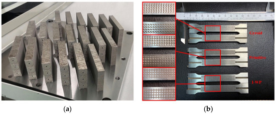 The porous test specimens manufactured by SLM are shown (a) and the internal structure of the test specimens (b) [27].