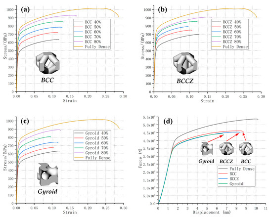The stress-strain curves of metal lattice test specimens (a) BCC and (b) BCCZ, as well as (c) the gyriod TPMS porous test specimen, all with 40–80% relative densities. The corresponding geometric model of the unit cell is provided. The stress-strain curve of the original test specimen was used as a reference. (d) The force-displacement curves of metal lattice test specimens BCC and BCCZ, as well as the gyriod TPMS porous test specimen, with a relative density of 80%. The force-displacement curve of the original test specimen was used as a reference.