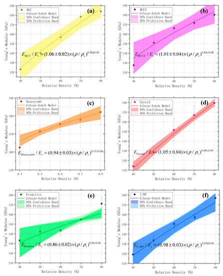 Gibson-Ashby model fitting curves for test specimens with the following lattice structures: (a) BCC; (b) BCCZ; (c) honeycomb; (d) gyroid; (e) primitive; and (f) I-WP. The darker and lighter colored bands in each figure represent the 95% confidence band and 95% prediction band, respectively.