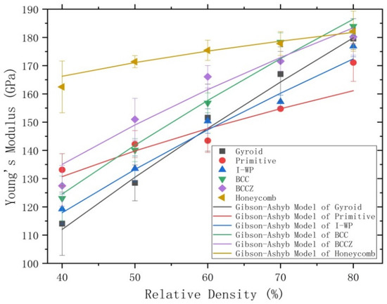 When comparing the Young’s modulus of the different porous test specimens (Figure 8), the differences are more obvious at lower relative densities, but then the values become more similar as the relative density increases. All six porous test specimens can be divided into two groups, according to changes in their Young’s modulus with relative density. The Young’s modulus of the BCC, BCCZ, gyroid, and I-WP porous test specimens all showed steep slopes as relative density increased, indicating that their structural rigidity is greatly affected by changes in relative density. However, the Young’s modulus of the honeycomb and primitive porous test specimens exhibited relatively gentle slopes as relative density increased.