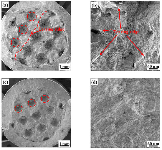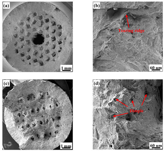 The overall fracture surface of the honeycomb porous test specimen (Figure 12a,c) is similar to that of the primitive, as it also can be divided into three areas. The pore area has an irregular shape due to the deformation of the test specimen. The fracture surface of the 5H unit cell is relatively flat (Figure 12a,b), with its microscopic morphology being dominated by river-like patterns and presenting few tearing ridges. On the other hand, the fracture surface of the 7H unit cell is uneven, but the transition is smooth and there are a large number of tiny holes on the fracture surface (Figure 12c). With higher magnification (Figure 12d), we observed that these tiny holes are actually large dimples (tens of microns in size) in which smaller dimples are nestled. This phenomenon shows that the 7H test specimen experienced a more complicated stress evolution process during fracturing. When the stress breaks the tensile limit the unit body quickly releases the deformation to absorb the energy of the breaking front, which terminates failure or directs it elsewhere. As a result, the microscopic morphology constitutes a large number of uniformly distributed dimples on the unit cell fracture surface, indicating that 7H has excellent toughness.