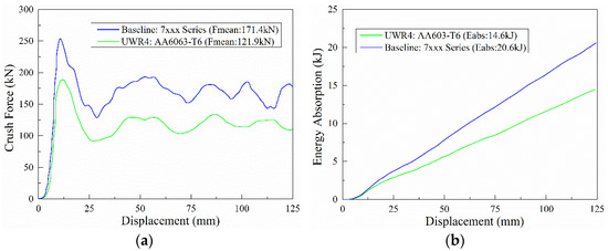 Experimental (a) fore-displacement and (b) energy response for baseline profile-7xxx series and UWR4 profile-6063-T6.