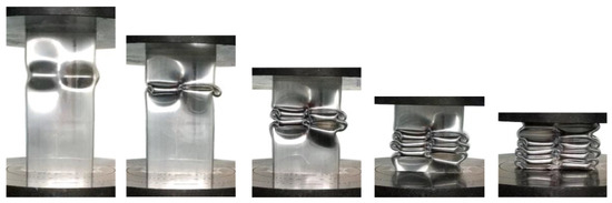 Consecutive stages of collapse of the G3 extruded profile sample under compression test.