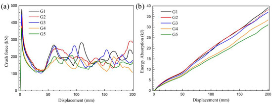 During the crushing process, the G2 alloy was ruptured when the compression displacement reached 152.7 mm, corresponding to which the load caused by the tearing material accumulation increasing rapidly and exceeding the previous peak value, as shown in the red curve in Figure 6a. In practice, when this happens to the energy-absorbing parts, adjacent auto parts will be damaged, thus losing their energy-absorbing and protective effects. Therefore, this energy absorption due to material accumulation is invalid and cannot be counted in the total energy absorption of the G2 alloy. In Figure 6b, the energy absorption curve of the G2 alloy in the post–collapse is marked as a dashed line and only the solid line is included in the final crushing performance results listed in Table 2.