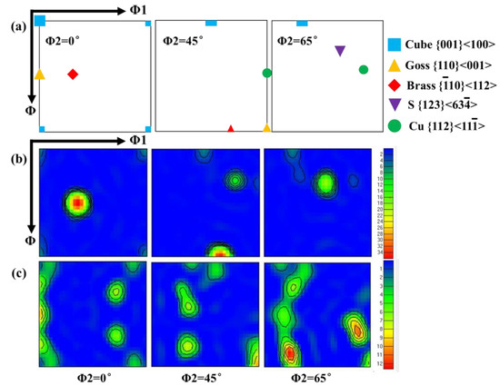 Φ2 = 0, 45, and 65° sections of orientation distribution functions (ODF) maps of Al-Zn-Mg alloy extrusions: (a) Marked locations of texture components; (b) G1 samples; and (c) G2 samples.