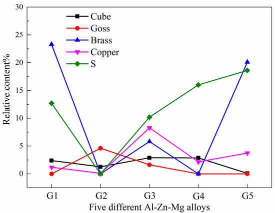 By comparing the cross-section micrographs microstructure of the characteristic area of G1 and G2 samples after crushing tests (as shown in Figure 7), it can be found that the surface layer in the sample cavity of G2 alloy extrusions has an obvious coarse grain ring (thickness about 0.3 mm). This is because the inner wall of the hollow cavity has a more severe material flow during the crushing process, the friction is greater between the material surface and mold. This difference between G1 and G2 alloys under the same extrusion process indicates that when the Zn/Mg ratios is low and the Mg content is similar, G2 alloys with a higher Zn content have a higher tendency of recrystallization during hot deformation. This tendency can also be reflected by comparing the recrystallization fraction in the EBSD analysis results of the central layer of G1 and G2 alloy samples shown in Figure 8 (the samples are taken from the box marked positions of B1 in Figure 7a and B2 in Figure 7b, respectively). The recrystallization fraction of the central layer of G2 alloy extrusions is relatively higher. Figure 9 shows the orientation distribution functions (ODF) of G1 and G2 alloy samples (φ2 = 0, 45, and 65°). Figure 9a shows the position labeling of major texture components in ODF. Comparing the G1 and G2 alloy, the texture intensity of the G2 sample was significantly weakened due to the relatively higher recrystallization of G2 alloy as shown in Figure 9b,c. Among them, goss texture intensity was increased, whereas intensities of brass texture and S texture were significantly weakened, while cube texture and copper texture have little difference. In order to distinguish and quantify the texture components characteristics of different main component alloys more clearly, the texture components of five different alloys was statistical analyzed as shown in Figure 10. The texture in G1 sample was dominated by a strong brass texture and S texture, while the texture in G2 sample was only the weak goss texture. The texture in G3 sample was composed of strong brass, copper, and S texture components. The texture in G4 sample was dominated by the strong S texture, while the texture in the G5 sample was dominated by a strong brass texture and S texture. These results illustrated that different main compositions can affect the texture composition and intensity of Al-Zn-Mg extrusions. The textures in the G2 sample almost only exists recrystallization textures, while deformation texture was dominant in G1, G3, G4, and G5 samples. Obviously, the above- mentioned coarse grain ring is prone to generate microcracks when it is compressed and folded. It can be seen that a large number of microcracks are gathered in the inner wall coarse grain ring of the G2 alloy with a large folding deformation. It can be seen in the A2 region with the largest folding that this aggregated microcracks have propagated into the internal grain microstructure. According to the simulation research results of Hartmann Matthias et al. [23] on this double–cell rectangular thin-wall extrusions, the maximum tensile stress occurs in the inner wall of the corner region of the middle T-shape during the folding process. It was safe assumption that the coarse grain ring in this area must preferentially aggregate the cracks, resulting in rupture from the middle of the G2 alloy extrusions.