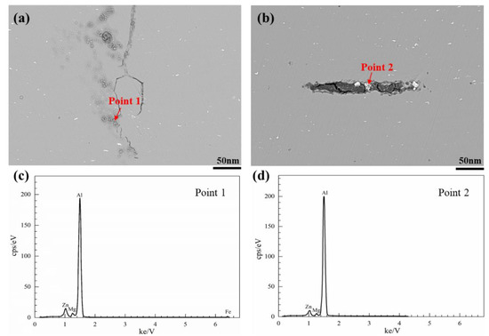 SEM photographs of cracking areas of compressed G2 specimens (a) and (b), and EDS analysis results (c) and (d).