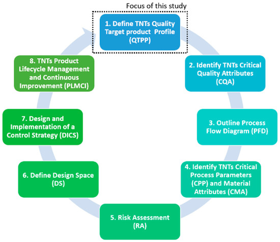 The purpose of this research is to provide researchers and industry with an in-depth adaptation of the Quality by Design (QbD) system for the fabrication of additively manufactured porous Ti implants considering the QbD guidelines for 3D printed bone implants and scaffolds [74]. The QbD system is composed by eight main steps that need to be systematically followed to acquire a complete comprehension of the product and its manufacturing process, including the identification and control of all variables to achieve the desired quality. Specifically, the scope of this present study was limited to the first step of the QbD framework (Figure 1). Thus, the objectives of this study are: