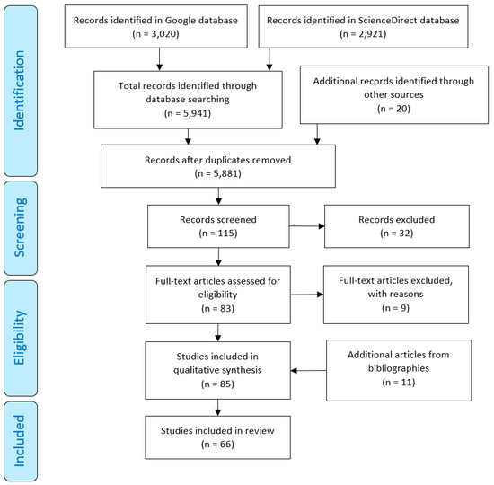 Selected studies in the systematic literature search were limited to the following inclusion criteria: (1) peer-reviewed papers with full-text published within the last 20 years (2000 ± 2020); (2) empirical studies reporting the mechanical properties of Ti and Ti alloy porous scaffolds produced by AM for bone repair; (3) published in the English language; (4) the first 10 pages of the search results were assessed; and (5) the search results were sorted by relevance. From the systematic literature search in both the Science Direct and Google Scholar databases, a total of 5941 results were generated from which 83 articles were fully assessed, as presented in Table 1 and Figure 2.