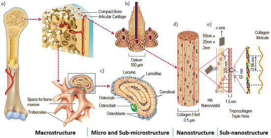 Bone’s sub-microstructure, from 1 to 10 µm, is composed of lamellae which in cortical bone compromise the concentric layers of osteons and in cancellous bone lamellae forms the trabeculae volume [150,151]. The sub-nanostructure of bone, below a few hundred nanometres, is composed molecular constituent elements, such as collagen, non-collagenous organic proteins, and mineral. From a few hundred nanometres to 1 µm is bone’s nanostructure comprising fibrillar collagen with embedded hydroxyapatite nanocrystals [152].