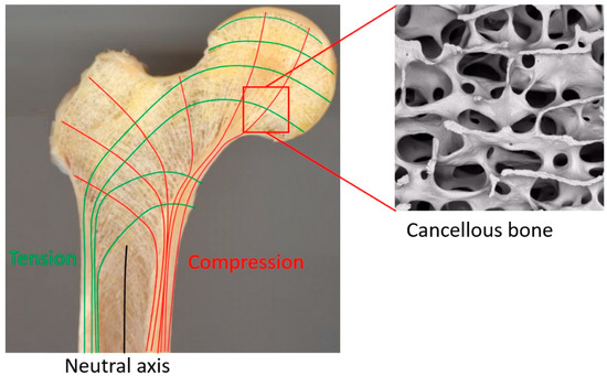 The two different types of bone, cortical and cancellous, have completely different mechanical properties; therefore to specify the properties of bone as one material, both bone types must be considered. Cortical bone is highly dense an act like a shell that provides the greatest stiffness and resistance to bending. In contrast, the mechanical properties of cancellous bone are determined by its apparent density and trabecular architecture. The trabecular structure of cancellous bone is arranged accordingly to the stress distribution of load, as shown in Figure 5. As a result, the least material is used in the most strategic locations to carry the greatest loads with the least strain [156].