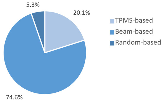 Distribution of experimental studies on beam-based, triply periodic minimal surfaces (TPMS), and random based geometries for bone implant applications.