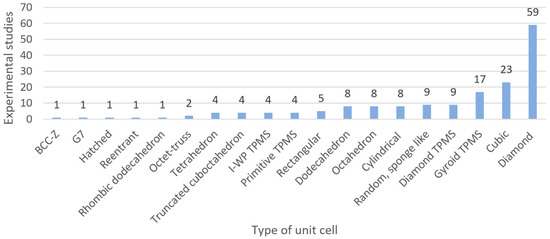 From all the different possible unit cells that can be used to produce metamaterials, a total of 17 types of unit cell were used by the selected studies, as presented in Figure 7. According to Figure 7, the beam-based diamond unit cell (59 studies) was the most used, followed by the cubic (18 studies), and the gyroid TPMS (17 studies). These results correlate with the opinion of different experts who have stated that the diamond unit cell is the most studied for the development of metamaterials due to its biomimetic mechanical properties [121,182]. The high mechanical properties and self-supporting properties of the diamond unit cell are due to its unique geometrical arrangement, where one node is tetrahedrally surrounded by four other nodes coming from the crystal structure of the diamond crystal [113], as shown in Figure 8a. Moreover, this arrangement gives 48 symmetry elements to the diamond structure, making this unit cell invariant to different symmetry operations such as translations, reflections, rotations, and inversion [183]. Similarly, extensive research for bone regeneration has been performed to study the cubic unit cell (Figure 8b). The research interest in the cubic unit cell is because it is based on one of the simplest and easy–to–manufacture platonic solids thanks to its struts at an angle of 90° [62]. In the case of porous metamaterials based on the gyroid TPMS (Figure 8c), they have been found to exhibit similar topology to human trabecular bone, and also superior mechanical properties compared with metamaterials based on other types of TPMS [120]. For example, according to Yang et al. [184] metamaterials based on the gyroid TPMS have a more homogeneous stress distribution, which can provide equal mechanical stimulation to bone cells.