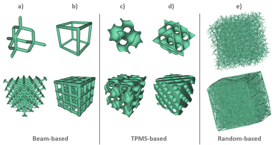 In the case of irregular porous structures, are created in a random way to generate irregular porous structures that mimic trabecular bone geometry and mechanical properties [179]. These irregular structures are generated using the Voronoi and Delaunay tessellation methods. Irregular structures have been found to further enhance scaffold’s permeability and bone ingrowth compared with porous structures designed with regular unit cells [180]. According to our results only 5.3% of the studies used a randomised design approach to create irregular porous structures to mimic trabecular bone. This result was surprising considering that irregular porous structures were the first additively manufactured coatings used for orthopaedic implants in the medical industry. However, unlike random porous scaffolds, the great advantage of using regular repeating arrays of unit cells made of beam or sheet-based geometries is that they allow the creation of metamaterials with properties that can accurately be predicted [181]. This explain why these design strategies are preferred in research.