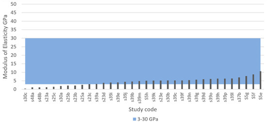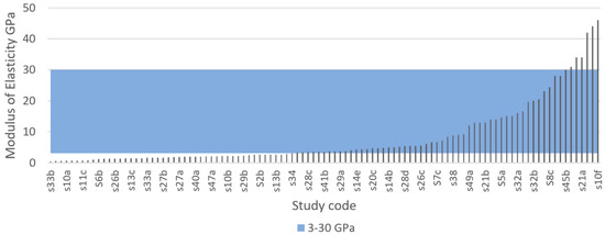 The mechanical properties of cortical and cancellous bone are difficult to measure, and tend to vary depending on bone orientation, test methods, mathematical formulas, and assumptions [146,151,159]. According to Chen and Thouas [57], the elastic modulus of cortical bone is approximately 11–21 GPa in the longitudinal direction and 5–13 GPa in the transverse direction. Another study suggested 18–22 GPa [147], whereas Wang et al. [81] suggested a range of 3–30 GPa. Cortical bone has a porosity of less than 10% [85]. The elastic modulus of cancellous bone is estimated to be 0.02–6 GPA and it has a high porosity of 50–90% [85,86].