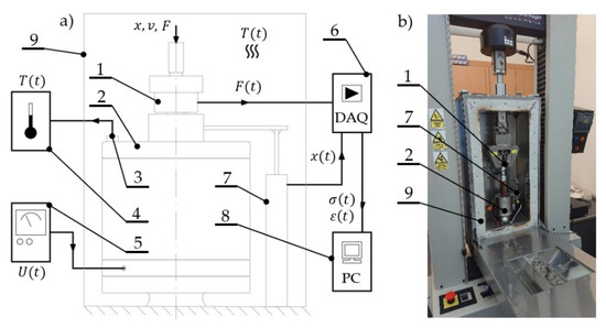 Measurement system: (a) diagram, (b) view: 1: force sensor, 2: measurement position, 3: temperature sensor, 4: temperature converter, 5: laboratory power supply unit, 6: measurement amplifier, 7: displacement sensor, 8: computer, 9: climate chamber.