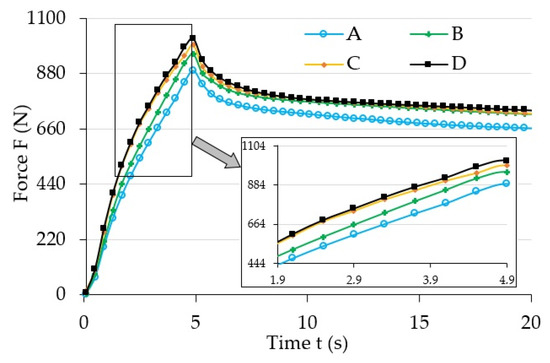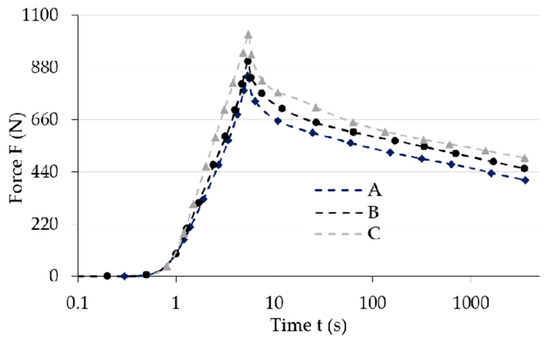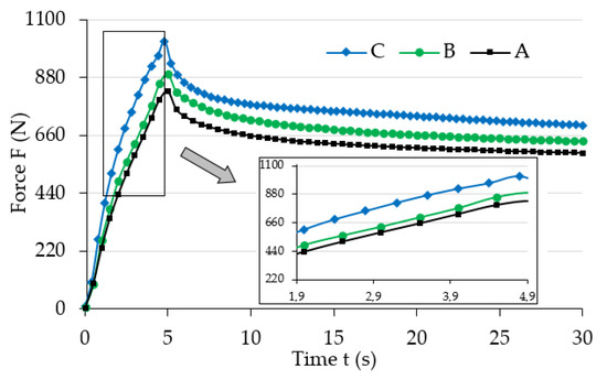 The analysis of the results (Figure 4) allows noticing the increase of maximum force (strain) value for the examined samples that occurred along with the increase of magnetic field induction, . It also had an influence on the progress of the stress relaxation process in the examined samples. The collected results suggest that the increase of magnetic field parameters caused the increase (extension) of the load relaxation time. Such a phenomena can be explained by the mutual influence of the magnetic field and ferromagnetic particles. During manufacturing they showed a tendency to group in columns, according to the direction of the applied magnetic field [32], due to magnetization. In addition, ferromagnetic particles aim to properly orient their easy magnetization directions in space, that is, in parallel to the line of magnetic flux. Their arrangement is the result of the system’s attempt to reach the state of minimum energy. In this position they will be fixed after the curing completion of the polymer matrix. Later deformation of such material requires a greater amount of energy, i.e., performing additional work (applying greater force), when compared to the deformation of magnetorheological elastomer not subjected to the magnetic field. This energy is used to relocate ferromagnetic particles from positions with minimum energy. The amount of required work to be supplied depends on the intensity of the applied magnetic field [33]. Thus, an apparent increase of mechanical properties, for example, the stiffness module, which are the function of magnetic field induction, will be observed when analyzing the properties of MRE samples on a macro-scale. The value of stiffness module has a direct impact on the progress of the discussed process in relation to both the maximum force (load) value, and stress relaxation time.
