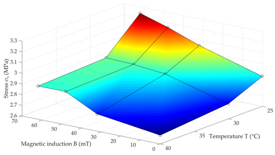 The properties of a magnetorheological elastomer as a composite material strongly depend on its manufacturing method, and the materials used for this purpose [3]. Quite often, various non-magnetic additives for the polymer matrix material are used to change the MRE mechanical properties, while maintaining the fixed content of magnetic phase [34]. As a material group, elastomers are characterized by strongly developed rheological properties. For this reason, the influence of amplitude and deformation velocity on the MRE properties also cannot be omitted in general. These two values in the discussed experiment were fixed, and therefore their influence on the recorded results was not determined. This was taken into account when determining the maximum load value () as a function of temperature () and magnetic field induction (), which has been shown in Figure 7. This physical quantity carries the information about the stiffness of the examined composite, and can be used as an indicator of upcoming changes in mechanical properties. Depending on magnetic induction (), the values of relative stress amplitude increases were determined according to dependence (1):