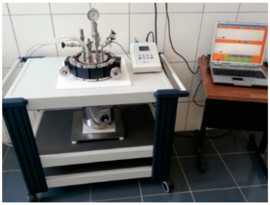 Nanostructured perovskite material (Ba0.75Sr0.25) (Ti0.95Co0.05) O3 encoded as BSTCo5 was synthesized in a one-step process by hydrothermal method starting from water-soluble salts of Ti, Ba, Sr, and Co, respectively. TiCl4 (Sigma-Aldrich, St. Louis, MI, USA, p.a. 98%), Sr (NO3)2 (Merck, Kenilworth, NJ, USA, p.a. >99%), and Ba (OH)2 8H2O (Merck, e p.a. >98%) were used as precursors, and KOH was used as a mineralizer. The amounts of Ba (OH)2 8H2O, Sr (NO3)2, Co (NO3)2 6H2O (Sigma-Aldrich, p.a. >99%), and TiCl4 were established in agreement with the theoretical molar formula (Ba0.75Sr0.25) (Ti0.95Co0.05) O3. The precipitation reaction pH was in the range of 9.5–13. The suspension thus obtained was subjected to hydrothermal processing (pressure 40 atm, temperature 200 °C, and time 2 h). The final suspension was introduced into a Teflon vessel of a sealed hydrothermal autoclave reactor (5 L, Berghof Products + Instruments GmbH, Berghof, Germany (Figure 1)) endowed with a cooling system. To control the reaction pressure, argon gas was purged inside the autoclave, according to working procedure described in [30].